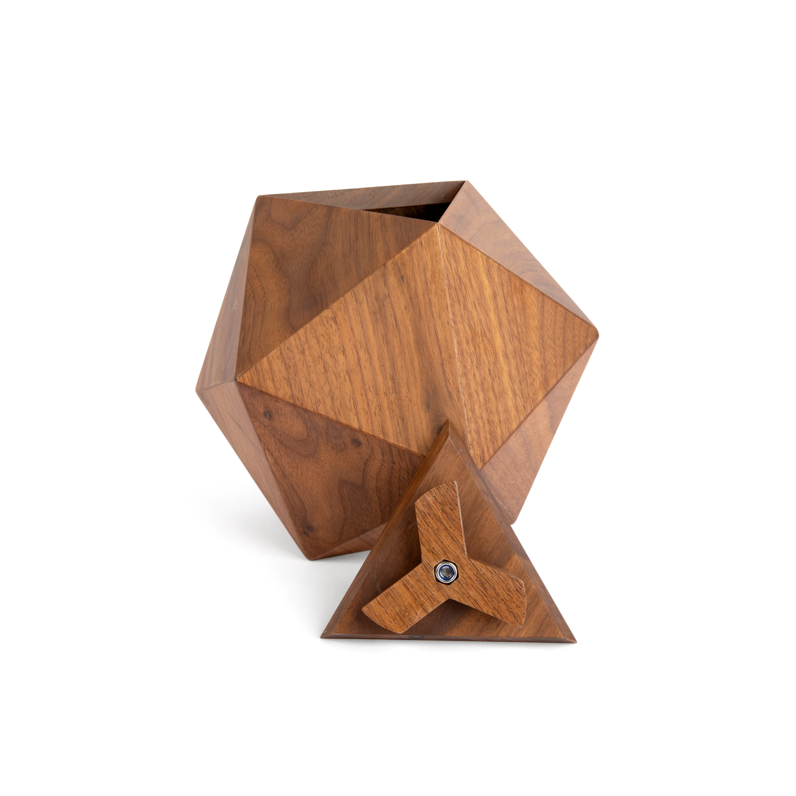 Handcrafted by master artisans, the BleeckerĀ urn is a stunningly unique art piece to memorialize a loved one. Made from Walnut wood, this 20-faced urn, known as an "icosahedron," draws inspiration from 1920s Art Deco design and the natural beauty of various trees. Available in Small, Medium, and Large sizes, it is made from the finest Walnut wood chosen for its strength, beauty, and stability, ensuring a fitting tribute to your loved one. The lid, designed to insert ashes, can be easily removed by unscrewing it from the top, which unlocks using our three-pronged latch mechanism (see photo).