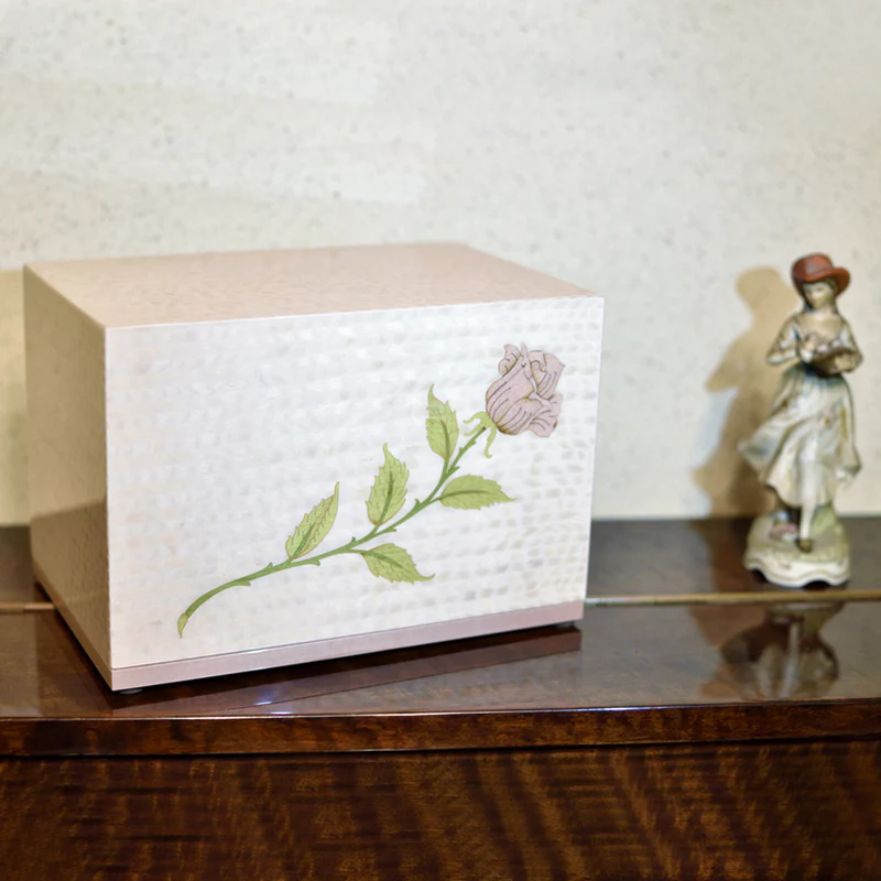 This stunningly unique, modern art Rose urn is handmade from rare, Italian-sourced wood and is an elegant way to memorialize your loved one. A candid and fragile rose will lie on your loved one forever. Petals and leaves, beautifully crafted, make this cremation urn a piece of art. The interior of the urn is made from mahogany wood where you'll find a plastic bag closed with an elegant black satin ribbon. The urn opens with 4 screws from the bottom. Our wood is sustainably sourced and highly respectful of environmental biodiversity.Ā