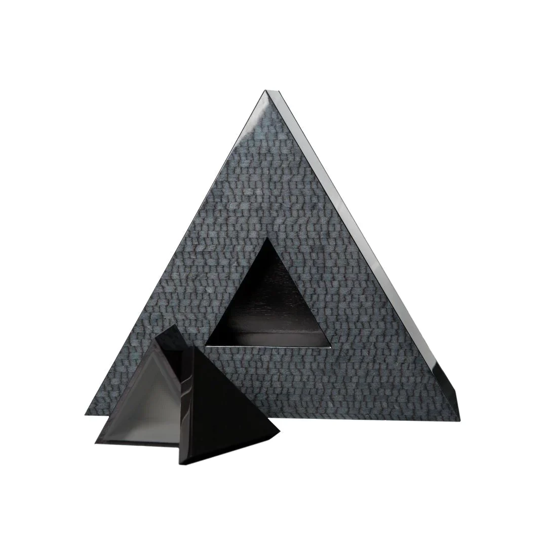 Handcrafted in Italy, The Soul is a one-of-a-kind urn made from rare, sustainably-sourced woods. The middle triangle box can slide in and out, opens with a lid and can hold keepsakes like a watch, jewelry or letter. Available in 5 styles: Cream, Grey, Navy, Warm Brown and Vibrant Multicolor. The interiors of the keepsake box are made of Florentine velvet. The interiors of the outside triangle are made from mahogany woods. A special plastic bag and ribbon is provided within the outside vessel. Our wood is sustainably sourced and highly respectful of environmental biodiversity. Engraving is available.Ā